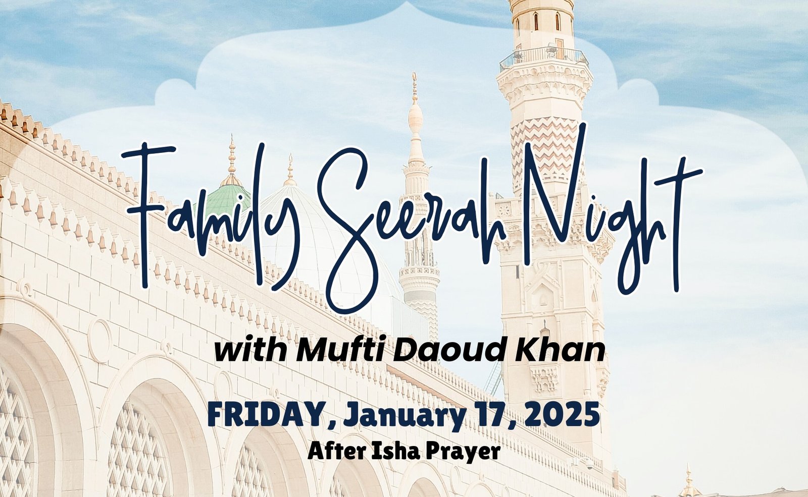 Join us for an inspiring and heartwarming Family Seerah Night as we gather to learn about the life and teachings of our beloved Prophet Muhammadصلى الله عليه وسلم. Led by the esteemed Mufti Daoud Khan, this evening promises to deepen your love and understanding of the Seerah while fostering meaningful connections within the community.